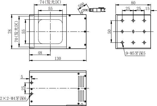 高密度的LED阵列发射出高强度均匀光,通过一种带有特殊层的半透面反射出的光线与相面在同一轴线上,并可消除采集图像和反光现象,成像清晰,高效散热,能凸显物体表面不平整