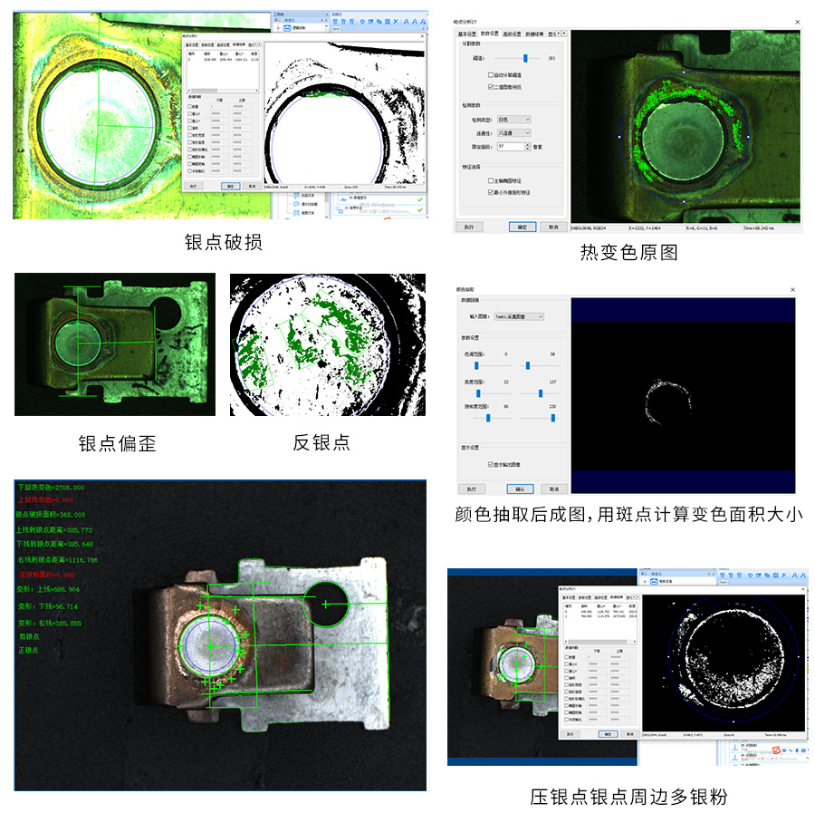 该方案聚焦三大类核心检测需求,覆盖生产全流程质量把控。针对银点相关缺陷,可精准识别银点缺损、偏歪、热变色、正反装错误、周边多银粉等问题。通过高分辨率彩色相机采集图像,结合颜色抽取与斑点分析技术,能快速区分银点与银粉的光学特性,即使是微小的破损面积也能精准捕捉。对于银点偏位检测,系统通过识别银点中心到三条基准边的距离进行判断,配合远心镜头的高精度成像,检测准确率可达 98%。