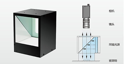 高密度的 LED 阵列发射出高强度均匀光,通过一种带有特殊层的半透面反射出的光线与相面在同一轴线上,并可消除采集图像的重像和反光现象,成像清晰,高效散热,能凸显物体表面不平整,克服表面反光造成的干扰。适合于经过镜面加工的工件表面划痕的检测。