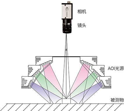 红绿蓝三种颜色光按照特定不同角度照射,实现三维信息提取,亮度高,检测速度快。